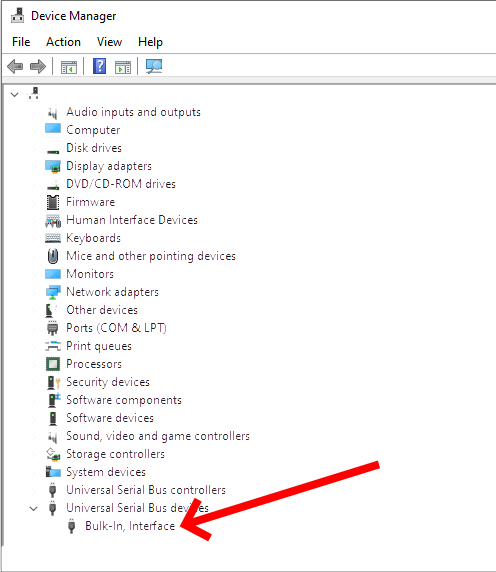 The Setup program installs the application and will then prompt you to run the Zadig utility program to install the WINUSB driver. Please follow the accompanying instructions. When the driver software is successfully installed and the RTLSDR receiver is recognized by the Windows operating system then you should see the "Bulk-In, Interface" device under the "Universal Serial Bus device" node in Device Manager (see below):