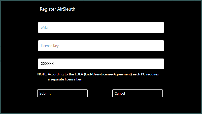 The first time the application is launched you will be prompted to register the application. When the software was purchased you received an email with your license key. To register the program enter your email address (the one used when you purchased the software) and the license key you received by email. The serial number of your PC also appears. If registration is successful then the registration information is persisted on the machine and you will not be prompted again. However, in order to validate the license key your PC needs to be connected to the Internet each time you launch the app. If a local Wi-Fi access point is not available you can use your mobile phone as a temporary hot spot -- it costs nothing and works the same as connecting your PC to an access point.